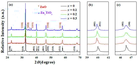The structure of the BNKT-BT-xZnO composites was investigated by means of X-ray diffraction (XRD), and the results are given in Figure 1a. For pure BNKT–BT, there is no secondary phase observed, besides a pattern of a typical perovskite structure within the equipment precision. The major phase belongs to the titanate Bi0.5M0.5TiO3 (M = K, Na), implying that the solid solution BNKT–BT was well-formed. Some important details are depicted in Figure 1b,c. An obvious peak splitting of (003) and (021), located around 40°, indicates a rhombohedral symmetry, while two diffraction peaks (002) and (200), appear around 46.5°, demonstrating a tetragonal symmetry [19]. Hence, pure BNKT–BT ceramic maintains a rhombohedral–tetragonal morphotropic phase boundary (MPB). With ZnO content increasing, another wurtzite diffraction pattern of ZnO appears, suggesting the existence of an independent ZnO phase. Since the interaction of the matrix and ZnO nanoparticles is inevitable, a small quantity of Zn2+ ions enters into the matrix lattice during sintering. Considering that Zn2+ (0.74 Å) and Ti4+ (0.605 Å) are close in radius [13], the substitution of Zn2+ for Ti4+ occurs easily, shifting the diffraction peaks to a lower angle direction. The maximum value of the shift angle is 0.1°, achieved in the component x = 0.3. Moreover, the impurity phase of Zn2TiO4, the impact of which is often ignored for the non-ferroelectric nature [12], is also detected.