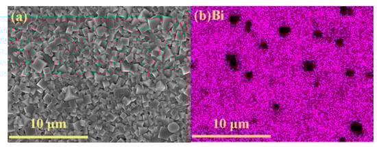 The information about Zn distribution was determined by the energy dispersive spectroscopy (EDS), and the element mapping results of BNKT-BT-0.3ZnO are presented in Figure 2. As shown in Figure 2a, under the influence of tetragonal BKT and BT, the grains of the ceramic composites exhibit a cubic shape after sintering. The average grain size reaches 0.91 ± 0.23 μm, demonstrating relatively inadequate growth. According to Figure 2b, Bi locates on a wide-range connected zone, except for some micron-sized regions, and a similar distribution of Ba and Ti is also verified by Figure 2c,d, which suggests the matrix fails to occupy the whole space. On the contrary, as shown in Figure 2e, Zn mainly distributes in these isolated regions. The element mapping results reveal that most ZnO nanoparticles gather to grow into micron-sized enrichment areas, which insert in the matrix to form 0–3 type ceramic composites.