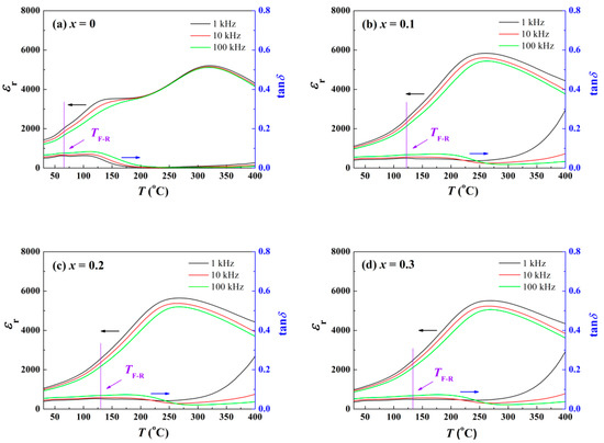 The temperature dependent relative dielectric constant εr and loss spectra tanδ of BNKT-BT-xZnO composites: (a) x = 0, (b) x = 0.1, (c) x = 0.2, (d) x = 0.3.