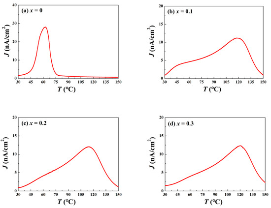 Temperature dependent thermal depolarization current density J for BNKT-BT-xZnO composites: (a) x = 0, (b) x = 0.1, (c) x = 0.2, and (d) x = 0.3.