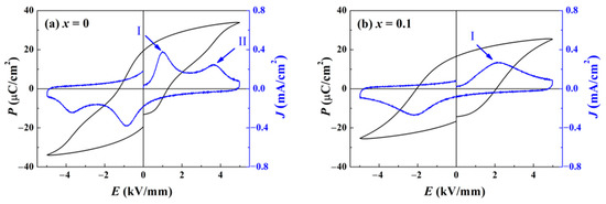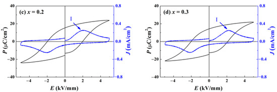 To inspect the influence of ZnO incorporation on domain reorientation and switching, the polarization P versus electric field E hysteresis curve (P–E loop) was measured for all the components at room temperature (RT). As shown in Figure 6a, since the TF-R of the component x = 0 approaches RT, the P–E loop exhibits some ergodic characteristics, including a small coercive field Ec and a shrinking shape. Through calculating the curve of polarization current density J versus E, two local maximums are discovered. The first (peak I) lies near the position of Ec, for the reason that numerous domains switch dramatically, which implies that peak I arises from the depolarization current [24]. The other (peak II) lies at the electric field that is about three times as great as Ec. This phenomenon suggests a portion of the domains nucleate and develop with the assistance of high loading. Combined with the fact the electric field facilitates the growth of PNRs in relaxor ferroelectrics, the origination of peak II is attributed to the PNRs’ reorientation [25]. With ergodic PNRs transforming into domains, P acquire a second boost to form a jagged hysteresis loop. For pure BNKT–BT, the impact of the deep ergodic degree overlays the “hard” doping effect of Zn2+, leading to a low Ec. When the ratio of ZnO reaches 0.1, as shown in Figure 6b, the loop shape is remarkably improved as a saturated ferroelectric loop. A maximum only arises around the position of Ec in the J–E curve, while peak II vanishes, which demonstrates a decline in ergodic PNRs. An enhanced coercive field Ec of 2 kV/mm is much higher than that of the component x = 0. All these variations confirm that the ergodic degree is greatly decreased. For more ZnO incorporation, as presented in Figure 6c,d, the loop shape barely changes. An evoked drawback is simply ascribed to the decrease in Pr and P maximum, which is attributed to a reduced ratio of the matrix and semi-conductor characteristics of ZnO.