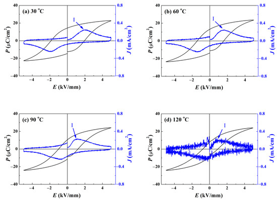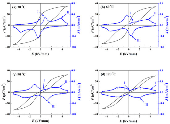 Temperature dependent polarization-electric field P–E hysteresis curve for the pure BNKT–BT: (a) 30 °C, (b) 60 °C, (c) 90 °C, and (d) 120 °C. As temperature increases, Peak I shifts towards the low electric field direction and Peak II shows the opposite movement tendency, which demonstrates an enhanced ergodic degree. The meanings of Peak I and II are the same as those in Figure 6. Peak III appeared above 60 °C denotes the maximum value of depolarization current density originating from the decomposition of the unstable domains.