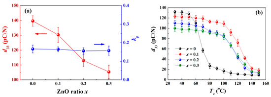 To evaluate the piezoelectric performance of the samples, two indicative parameters, i.e., the piezoelectric constant d33 and planar electromechanical coupling factor kp, are measured in Figure 9a. While the content of ZnO is increasing, both d33 and kp decline because of the reduced relative ratio of the ferroelectric matrix, which means partial loss of piezoelectricity [12]. Figure 9b provides the relationship between the annealing temperature Ta dependence and the remaining d33. The remaining d33 for the pure BNKT–BT ceramic drops rapidly in the temperature range of 60−80 °C. Since the phase transition from FE to ER finishes above 80 °C, only a negligible remaining d33 is detected. The components with ZnO incorporated show an improved temperature stability, holding the performance at a high level until 110 °C is reached. The following declining phase for the component x = 0.3 tends to be smoother. In view of superior properties when compared to the other components, the component x = 0.1 is more suitable for real application.