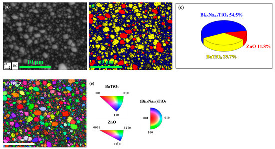 The patterns based on the electron backscatter diffraction (EBSD) were employed to understand the distribution of strain. A scanning area in the component x = 0.3, shown in Figure 10a, was selected for the purpose. According to the corresponding phase distribution and percentage offered by Figure 10b,c, three types of configurations exist in this area. The local regions, marked in blue and yellow, possess crystal structures close to Bi0.5Na0.5TiO3, and BaTiO3, respectively, which represents the distribution of the matrix; while the other regions, marked in red, have structures similar to ZnO, standing for the ZnO enrichment areas diffused in the matrix. The individual orientations of grains along the Z-axis of the laboratory coordinate system are provided in Figure 10d. Comparing the colored grains and the inverse pole figure color key in Figure 10e, it is revealed that both the grains of ZnO and the matrix orient themselves randomly. Since the potential stress field does not induce texture, the possibility of texture affecting depolarization behavior is excluded.