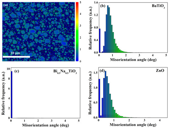 More pronounced strain occurs in the regions of composites where stress is concentrated. By means of calculating the displacements between adjacent sampling sites in the EBSD pattern, a speculation on stress field distribution is built up [27,28]. For the purpose, Figure 11 provides the image of local misorientation and the relative fraction of sampling sites corresponding to different misorientation angles. According to the Figure 11b–d, the maximum of the misorientation angle approaches 4.5°, which corresponds to the tiny areas marked in red in Figure 11a. All these areas are immersed in the blue region of the Bi0.5Na0.5TiO3 matrix. In view of the effect of abundant grain boundaries on measurement accuracy, this portion of misorientation can, in fact, be ignored. The majority of sampling sites have misorientation angles in intervals of 0° to 1.5°, which corresponds to the color transition region from blue to green. As shown in Figure 11a, grain boundaries are prone to exhibiting green, while the inner parts of grains are blue. Since the green area means larger strain, it is confirmed that the stress field prefers to emerge near the boundaries. With the stress effect of pinning domains, the hypothesis that stress field hinders domain decomposition to postpone depolarization is reasonable [29]. In addition, no particular stress effect is detected around the boundaries of BNKT-BT/ZnO. The result does not support the previous prediction, based on the difference in the thermal expansion coefficient of ZnO and the matrix.