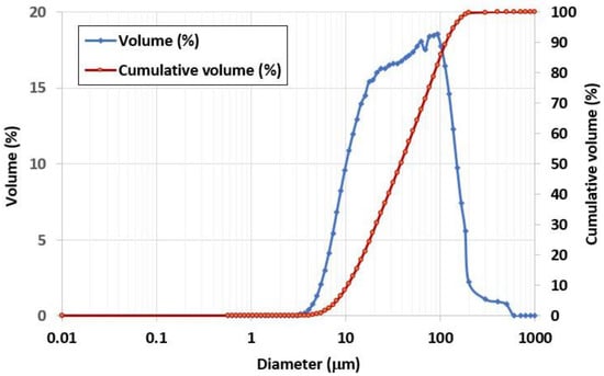 The CR used as a raw material for AAM production was obtained from a Chiang Mai local quarry of Sila Mae Tha Co., Ltd., Chiang Mai, Thailand. It was crushed into smaller sizes and sieved with mesh sieve no. 100, obtaining a fine material. The chemical compositions of the CR, determined by energy-dispersive X-ray fluorescence (EDXRF) analysis, are shown in Table 1. The average particle size of the CR, determined by dynamic light-scattering particle size analyzer (Nanosizer-DLS), was 50.2 μm. A total of 80% of CR particles were smaller than 90.7 μm, while their specific surface area was 0.2573 m2/g (Figure 3).