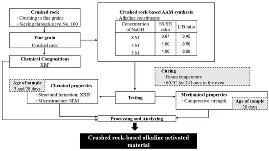 The mixture designations of CR-AAM are presented in Table 2. Figure 4 shows the framework and methodology of this study. First, fine-grained CR was analyzed for its chemical composition and morphology using XRF and XRD analysis. The main parameters for the study were the NaOH concentration, a mass ratio of sodium silicate/sodium hydroxide (SS/SH), and a mass ratio of liquid alkaline/binder (L/B). Two curing conditions were studied: room temperature (RT) curing and oven curing. CR and the specific amount of prepared alkaline solutions were initially mixed for two minutes. After 30 s, time was paused to remove some adhered paste from the middle of the mixing pot, then mixing was restarted for another two minutes. After thorough mixing, the freshly blended CR-based AAM paste was neatly cast into the prepared molds and wrapped with a plastic sheet to prevent moisture loss. For oven curing, the samples were placed in the oven at 60 °C for 24 h. Then, the samples were removed from the oven and allowed to cool down at room temperature (26 ± 3 °C). After 24 h of casting, all samples were demolded and wrapped with a plastic sheet and kept at room temperature until reaching the testing age. It is noted that the preparation methods and experimental factors were carried out following the previous research study and literature [34].
