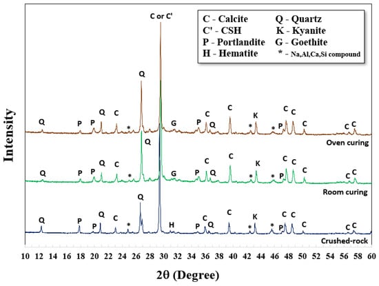 XRD analysis was carried out to investigate the structural formations and chemical compounds of both original crushed rock material and AAMs. For this study, 5 M NaOH with an L/B ratio of 0.50 and SS/SH ratio of 1.00 were set. The XRD patterns of the original crushed rock revealed a structure formation of quartz (Q), calcite (C), and portlandite (P) in the forms of SiO2, CaCO3, and Ca(OH)2, respectively. Aluminum oxide (Al2O3) and silicon dioxide (SiO2) were also found in different forms (* -Na, Al, Ca, Si compound). Hematite (H) at the small peak around 31.1 two-theta degrees referred to iron compounds in the raw material (Fe2O3). It was noted that a sharp peak of calcite located at 29.4 two-theta degrees referred to the rampant amount of calcium content in the crushed rock material; they were transformed into calcium silicate hydrate (C-S-H) after polymerization/hydration processes. Goethite (G), a form of soil or other low-temperature sediments, was observed as FeO(OH) or FeAl2O4 at the same peak of hematite around 31.1 two-theta degrees. Additionally, Portlandite (P), or Ca(OH)2, was found in both curing conditions due to the reaction of calcium compounds and hydroxide ions (OH−) in the systems. The quartz (Q) and aluminum compound in the original crushed rock, at 26.6 and 45.7 two-theta degrees, could be transformed to Kyanite (K), an aluminosilicate compound (Al2O5Si) in the structure. The graphs mainly show the sharp peaks, which indicate the formation of crystallinity. However, small humps of those alkaline-activated mixtures were also observed between 28 and 34 two-theta degrees, indicating the partial formation of amorphous phases of the alkaline-activated structure (Figure 5).