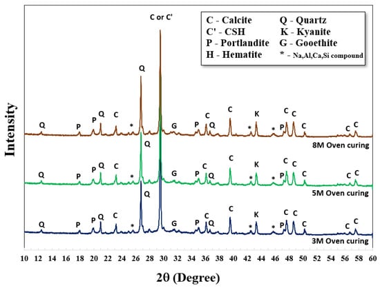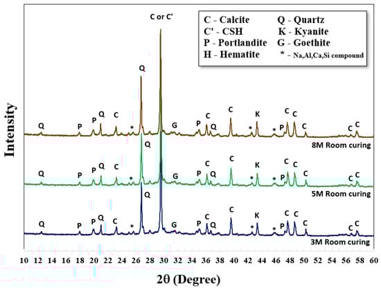 Comparative XRD patterns of AAMs with both curing conditions were also carried out at 28 days, as shown in Figure 6 and Figure 7. There were no significant differences in XRD results between curing at room temperature and 60 °C; the patterns were similar. Nevertheless, higher strengths were achieved using oven curing as compared to room temperature curing. Oven curing provided more polymerization, with a more robust polymeric chain and dense matrices.