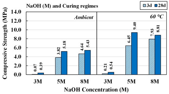 Compressive strength of AAM at various NaOH concentrations, cured at room temperature and at 60 °C.