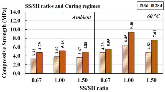 The effects of SS/SH ratios of 0.67, 1.00, and 1.50 on compressive strength and microstructures of CR-AAM were studied. Additionally, 5 M NaOH and L/B ratio of 0.50 were set for this study. Results are shown in Figure 13. A similar trend was observed compared with the effects of NaOH concentrations (Figure 10). The strength of all the mixtures was developed by the curing time, and high strength achievement occurred with oven curing at 60 °C.