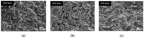 SEM images of the mixtures cured at room temperature with 5 M NaOH, an L/B ratio of 0.50, and various SS/SH ratios. (a) SS/SH = 0.67. (b) SS/SH = 1.00. (c) SS/SH = 1.50.