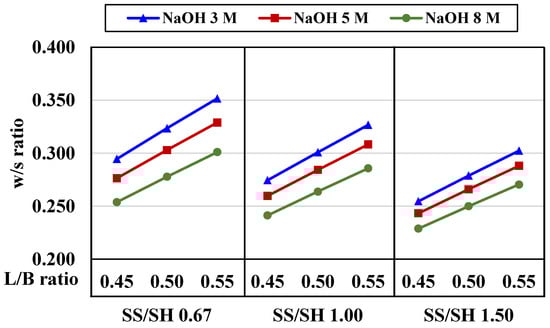 The water/solid (w/s) ratios are plotted against liquid alkaline/binder (L/B) ratios in Figure 15. Properties of the final hardened products, as influenced by the amount of water, could be observed: (i) the w/s ratios decreased when the NaOH concentration increased, (ii) the w/s ratios decreased when the SS/SH ratio increased, and (iii) the w/s ratios increased when the L/B ratio increased.