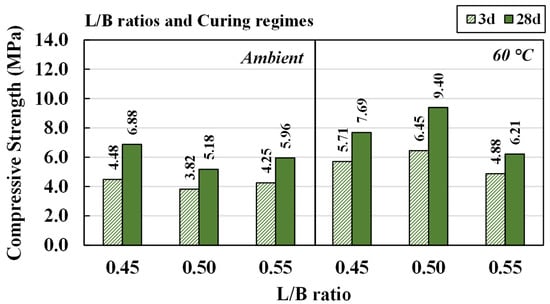 The highest compressive strengths were achieved for room temperature curing with an L/B ratio of 0.45, when aged for three days (4.48 MPa) and 28 days (6.88 MPa). The compressive strength levels were very close to each other when the L/B ratios were 0.50 and 0.55; they were lower than when the L/B ratio was 0.45. Additionally, the trend of compressive strength for mixtures cured at 60 °C was significantly different. The mixture obtained the highest compressive strength with an L/B ratio of 0.50, followed by 0.45 and then 0.55.