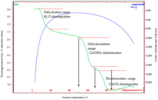 Figure 2), which was conducted from less than 100 °C to 1100 °C at nitrogen atmosphere and at a rate of 15 °C/min, confirmed the disintegration of the abovementioned phases with mass losses occurring mainly within the dehydroxylation range (i.e., 1.75% mass loss of labradoride/portlandite at 500–650 °C), as well as within the decarbonation range (i.e., approximately 1.2% mass loss of labradorite/calcite at 700–800 °C). It has to be noted that the recorded initial mass loss was attributed to the loss of humidity, whereas the transformation of quartz was not observed during the analysis, as the phenomenon is taking place in higher temperatures.