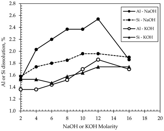 Figure 3. Based on the leached contents of both Al and Si metals, the highest dissolution percentage was noted at 12 M of NaOH or KOH molarity, beyond which, however, the efficiency of both reagents appeared to decline. The leaching amounts of both metals were higher when NaOH was used as the reagent compared to the case when KOH was used, although the contents were still very low to render the DM as a proper precursor for geopolymerization in both cases. The results from