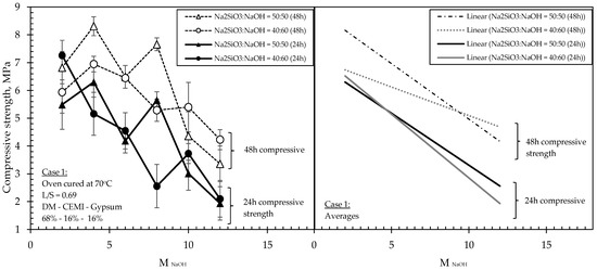 Figure 4, a general trend of compressive strength decrease with the increase of the alkalinity was observed with minor differentiations in the strengths (within a range of 10–15%). This trend is attributed to the fact that the DM cannot be dissolved in the alkaline solution, according to the results obtained from the dissolution tests. Therefore, the alkali presence and the increase of molarity did not affect the materials’ geopolymeric formation and the development of strength. In contrast, the increase of alkalinity seems to decrease the compressive strengths, since no geopolymeric reaction is taking place. On the other hand, the mix designs for Case 1 contain two pozzolanic materials (i.e., cement and gypsum) that favour the presence of water for developing high strengths. In mixtures of lower alkalinity, the cement and gypsum hydration reactions become dominant (due to a higher amount of unbound water, i.e., water not participating in the alkaline solution), thus resulting in higher strengths, as recorded.