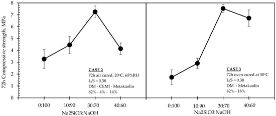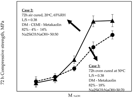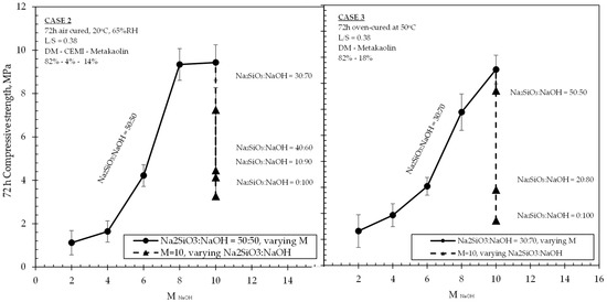 Figure 7 together due to the common presence of metakolin in the two different formulations, their identical age of testing (i.e., 72 h), and also some similar trends observed in the obtained experimental results. It was observed that the progressive increase in NaOH molarity caused an increase in the 72 h strengths of both sets of mixtures with an almost identical effect on strength values for 2 M and 4 M, and then, at higher molarities, reaching up to 9.43 MPa (Case 2) and 7.53 MPa (Case 3), respectively. When the molarity value increased from 6 M to 8 M, both sets of formulations experienced their highest increase rate in strengths (121% and 93% increase for Cases 2 and 3, respectively). Beyond 8 M and towards 10 M, Case 3 mixtures still exhibited an appreciable increase in strengths, which was even higher than that observed from 4 M to 6 M. In the same concentrations, however, the mixtures of Case 2 were not associated with any significant increase, indicating an optimum concentration between 8–10 M for their highest achievable strengths. The results in