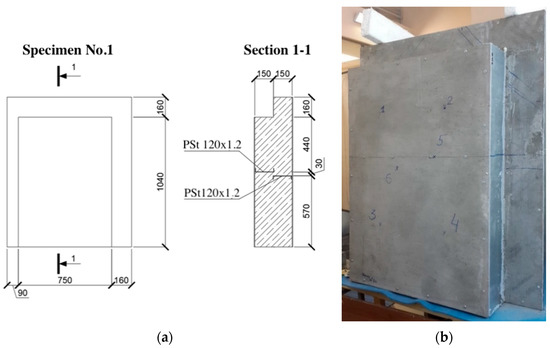 The first test specimen (see Figure 1) was used after 9 days of curing. The specimen had dimensions of 1000 (L) × 1200 (H) × 310 (W), where L, H, and W are the width, height, and thickness of the structure (in millimeters), respectively.