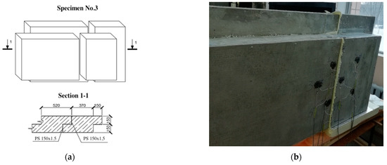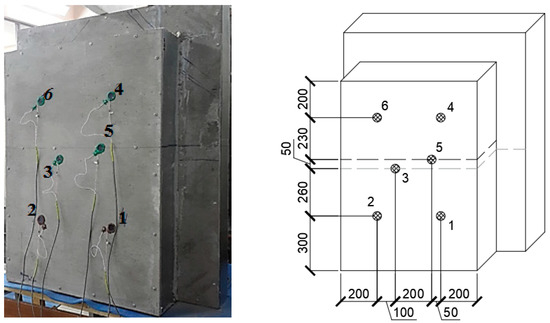 The third test specimen (see Figure 3) consisted of two panels. Dimensions of the first panel were 1000 (L) × 1200 (H) × 310 (W), and those of the second panel were 1000 (L) × 600 (H) × 310 (W), where L, H, and W are the width, height, and thickness of the structure (in millimeters), respectively. The specimen had a vertical field joint. At the junction of the panels, two layers of heat-insulating material Izolon were used.