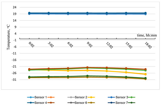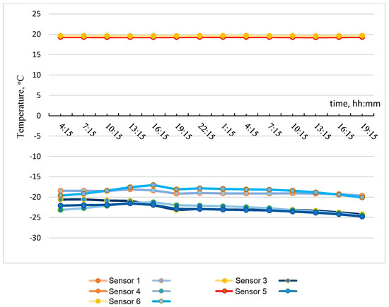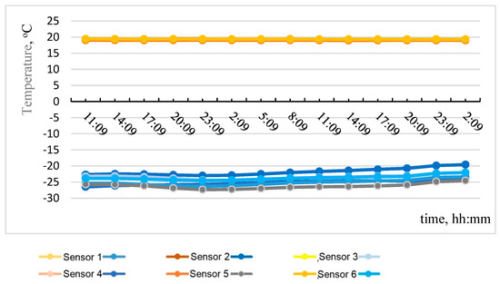 The tested models were placed in the design position. Further, the TX-500 climatic chamber was installed on one side, and the temperature in the cold (outer) part of the chamber was set at −30 °C. On the opposite side, there was the second heat-moisture-drying chamber SM 5/100–500; the temperature in the warm (inner) part of the chamber was set at +20 °C at a humidity of 60%. The part of the structure that did not fall into the screens of the chamber was insulated with heat-insulating materials to prevent the loss of cold and warm air from both sides of the structure.