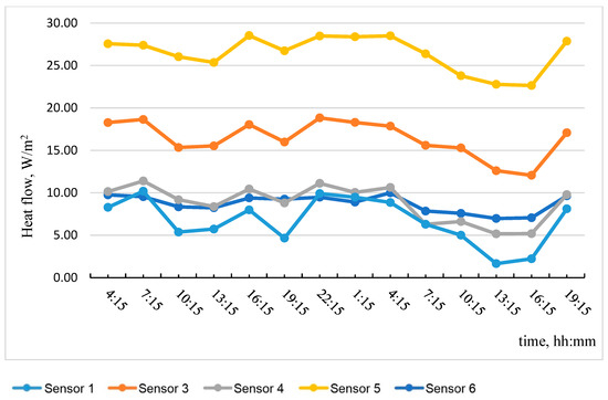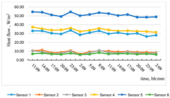 Table 5 shows the results of calculating the apparent thermal resistance in sensors 1–6 using Formula (3), considering the zones of the tested wall fragment.