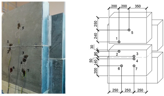 Sample No. 2, which has a horizontal field joint of two wall panels with installed thermal and temperature sensors, is shown in Figure 9. Seven sensors are used, four of which are located at the field joint, and three sensors are located on the foam concrete.