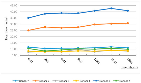 Table 3 shows the results of calculating the apparent thermal resistance in sensors 1–7 using Formula (3), considering the zones of the tested wall fragment.