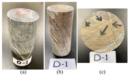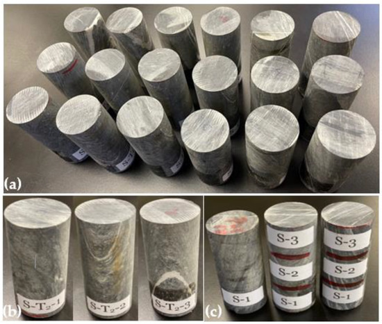 In this study, eighteen rock specimens (Figure 1a) were prepared using diamond drill-core rock samples obtained at the Najran area of Saudi Arabia. The intact drill-core samples were cut (using PT 100 GTCS Testing Systems, Tempe, AZ, USA) and surface-polished (using KGS618, Tustin, CA, USA) to 0.04 surface tolerance according to the ASTM standard D4543 [44]. The specimens were then dried at 105 °C for 24 h using a laboratory dryer (Binder Inc., Bohemia, NY, USA). Fifteen prepared specimens were labeled according to the test temperatures; T0, T1, T2, T3, and T4 are 22 (room), 200, 400, 500, 600, and 800 °C, respectively. Meanwhile, three samples were systematically selected for each target temperature based on their macroscopic differences in mineralogy, bedding, and foliation plane; the first sample had no visible quartz-carbonate vein, the second sample had a visible quartz-carbonate foliation plane, and the third one had a major quartz-carbonate vein, bedding, and foliation plane (Figure 1b), for quality assurance and quality control purposes and being able to analyze the behavior under these different foliation styles. Therefore, the three samples at 22 °C were, respectively, labeled as S–T0–1, S–T0–2, and S–T0–3 (where S represents a sample, T0 means room temperature, and 1–3 are the sample numbers).