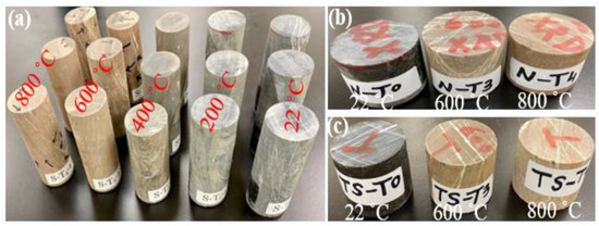 In this study, three specimens were heated at once at a heating rate of 2 °C/min to the target temperature, using a laboratory furnace (CHM-60H, Jim-bomb Enterprise Co., Ltd., Taiwan). This low heating rate was employed to ensure that the specimen is suitable for the UCS test; it does not break into pieces during the heating process [41]. After reaching the target temperature, the specimens were soaked at that temperature for 2 h to ensure that heat penetrated to the specimens’ matrices before they were naturally cooled inside the furnace to avoid thermal shock [28,41]. The different sets of specimens at all tested temperatures 200, 400, 600, and 800 °C, in addition to the room temperature set, are shown in Figure 2.