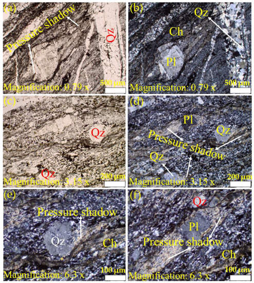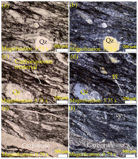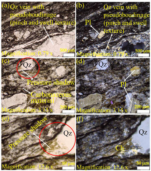 Due to intense metamorphic deformation, the primary rock texture was over-printed and altered, which caused granulation (recrystallization), cataclasis, mylonitization, shearing, and foliation subaugen-shaped blastophenoclasts show alignment parallel to the deformation plane (Figure 4, Figure 5 and Figure 6). The studied rock now displays unequigranular, blastoporphyritic, and flaser-fine textures. Late quartz-carbonate veins parallel to shear planes display distinct pinch and swell boudinaged microstructure (Figure 5a,b). However, the presence of blastophyres comprised of plagioclase and quartz are noticed in finely sheared and foliated felsic rock matrix (Figure 6a–f). Subaugen fabric and the local presence of pressure shadows at both ends of plagioclase and quartz blastophyres are apparent (Figure 6a–f).