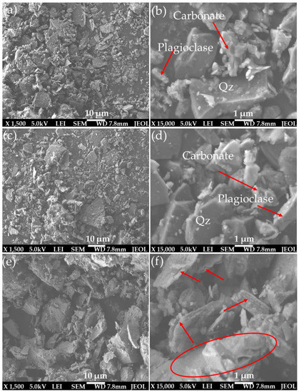 To better understand the effect of temperature on the sample’s morphological properties at a microscopic scale, a SEM analysis of the studied samples was performed at low and high magnifications. Figure 7 shows the photomicrographs from the analysis. As noticed using the thin-section approach, different minerals can be identified: quartz, plagioclase, and carbonate materials. It can be observed that the primary minerals’ morphology was completely modified by intense metamorphic deformation (Figure 7a–f). This observation agrees with that of the thin section. Comparing the sample at room temperature, 22 °C (Figure 7a,b) with that heated to 600 (Figure 7c,d) and 800 °C (Figure 7e,f), the findings show that at the microscopic scale, no cracks can be noticed for both the samples at 22 and 600 °C, whereas microcracks can be observed on the sample at 800 °C (as indicated by lines on Figure 7f). These show that microcracks were developed on the tested samples macroscopically but had no significant impact on the particles at the microscopic level (Section 3.5.2). It can also be seen that mineral alteration occurred on the sample heated to 800 °C, illustrated by an oval shape in Figure 7f, and can be attributed to the heating of the studied rock samples to 800 °C, which may significantly degrade their mechanical properties.