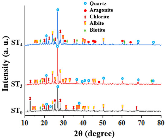 To study the mineralogy of the samples and the effect of temperature on the mineral phases in the studied rock samples further, XRD analysis was also employed. The results show that the mineral phases in the studied samples are quartz, aragonite, chlorite, albite, and biotite (Figure 8). These results reveal that the carbonate material that was not identified by both the thin section and SEM analyses is aragonite. The XRD analysis also confirmed that the albite’s plagioclase is identified similar to the results obtained by the thin section and SEM approaches. Meanwhile, chlorite and biotite are also confirmed by the XRD method as identified using the thin-section method. Sericite being suspected to be present by the thin-section method cannot be identified using the XRD method, suggesting that this mineral is not present in the studied samples as any of the employed methods cannot verify it. The results of the quantitative analysis indicate that there are variations in the mineral quantities (weight %) in the three samples, which confirms the anisotropic nature of meta-reworked rhyolitic tuff [51]. This can also be noticed in the spectra as slight differences occur in peaks. Nevertheless, this factor was considered during sample categorization for different target temperatures for quality assurance purposes. It can be seen in Figure 8 that after heating the samples, the peak intensities increased, and a slight phase shift can be noticed. This may lead to alteration in mechanical properties of the studied samples at a macroscopic scale due to the changes in crystallographic directions.