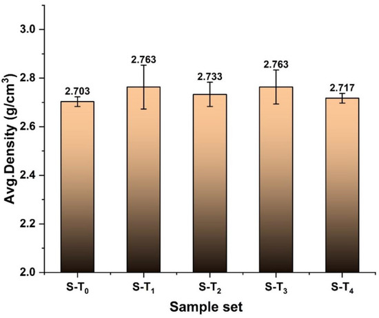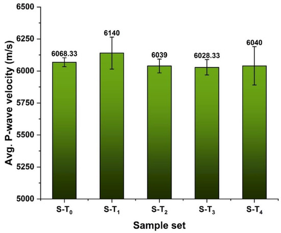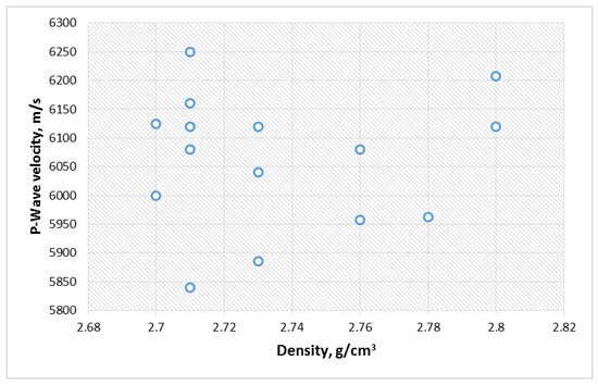 Table 3 presents the measured dry mass (M), diameter (d), length (L), calculated volume (V), density (D) and the P-wave velocity (Vp) of the studied samples. Due to the non-homogenous nature of the metamorphic rock, the average density of different specimens slightly varies with the standard variation of 0.024 (Figure 9). The P-wave velocity of the investigated different sets of specimens also varied with a standard variation of 40.65 (Figure 10). Despite the non-homogenous nature of the studied samples, the adopted sample categorization provides close density and P-wave velocity values, which are usually employed in sample selection operations [20]. However, a correlation between the two parameters cannot be established, as presented in Figure 11. This may be related to the variation in the quartz-carbonate vein in the studied samples.