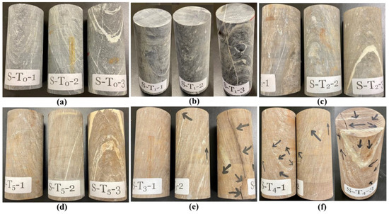 Figure 14 presents the specimens before and after heating (Figure 14a,d,g,j,m), schematic diagram of the samples; showing quartz-bedding-planes with positions of pasted strain gauges (Figure 14b,e,h,k,n), and failed specimens after loading (Figure 14c,f,i,l,m). Figure 14a shows the sample S-T0-1 to S-T0-3; the S-T0-1 is an intact specimen free of any visible cracks but with a quartz-bedding plane at the lower part, S-T0-2 is also an intact specimen with no quartz-bedding plane, while S-T0-3 is an intact specimen with many quartz-bedding planes. After axial compressive loading, S-T0-1 (Figure 14c) experienced failure on multiple tension at an angle of 87°. Some cracks were noticed on the foliation plane. For the specimen S-T0-2, the applied uniaxial compressive load cannot be sustained by the specimen; leading to its structural burst (Figure 14c; S-T0-2). After uniaxial loading on the specimen S-T0-3, double shear failure occurred on the bedding plane with a failure angle of 80° (Figure 14c; S-T0-3). The specimens S-T1-1 to S-T1-3 (specimens heated to 200 °C) have different failure behavior after uniaxial compressive loading. The S-T1-1 that is free of any visible cracks but with a quartz-bedding plane at the upper part experienced failure at an approximate angle of 90° (Figure 14f; S-T1-1). The S-T1-2 (intact rock with no quartz-bedding plane) has a single failure with an angle of 70° after pressure load. The S-T1-3 (quartz-vein on the specimen) has its failure along quartz-vein with an angle of 80°. As can be seen in the image (Figure 14g), S-T2-1 and S-T2-2 have small quartz-vein while S-T2-3 has quartz-carbonate veins. Multiple fractures occur on S-T2-2 while S-T2-1 and S-T2-3 burst after uniaxial compressive loading (Figure 14i). As presented in Figure 14j, S-T3-1 has a single bedding plane with a dip of 75° with a strain gauge vertically placed on the area without bedding (Figure 14k). After uniaxial loading, failure occurs on a non-persistent bedding plane (S-T3-1), leading to rockburst (Figure 14l). The specimen S-T3-2 (consisting of a quartz-bedding plane at the upper part) developed a major visible crack along the bedding plane and a few minor cracks after heating. Failure of this specimen is on a quartz-bedding plane and persistent bedding plane (Figure 14l; S-T3-2). For the third specimen heated to 600 °C (S-T3-3; many visible quartz-bedding planes), visible major crack > 1 mm at 80° dip developed due to heating. After loading, failure occurs on the multi-micro-cracks (S-T3-3). The specimens S-T4-1 and S-T4-2 have visible cracks along quartz-bedding-plane with lengths of up to 1 mm from both sides (Figure 14m,n). Failure occurs on a single bedding plane for the two specimens at 75° dip for the former and 53° for the latter (Figure 14o; S-T4-1, S-T4-2). Major crack > 1 mm at 80° dip developed on the specimen S-T4-3 (after heating to 800 °C) mainly along the visible quartz-bedding-plane (Figure 14m,n). Due to loading, failure occurs on this specimen on the bedding plane but with a dip angle 67°, and spallation of particles occurs (Figure 14o; S-T4-3). It is important to note that failure mostly occurs along the quartz-bedding plane in all the specimens, whether heated or unheated. Therefore, it is shown that this type of rock may create a serious structural engineering challenge due to its anisotropic nature [51].