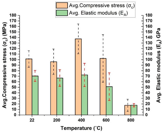 The average compressive stress and elastic modulus for the investigated samples at different temperatures, red and black dotted lines represent uncertainties in stress and elastic modulus.