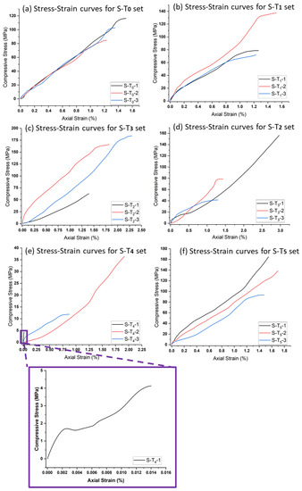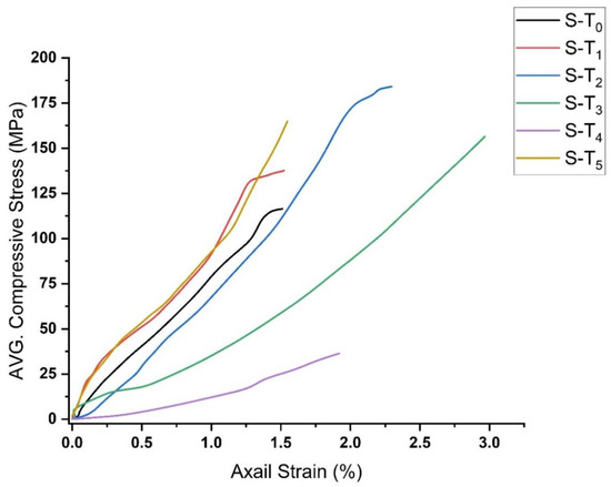 Comparison of the stress–strain curves of the investigated specimens at different temperatures (S-T0; specimens at 22 °C, S-T1; specimens at 200 °C, S-T2; specimens at 400 °C, S-T3; specimens at 600 °C, S-T4; specimens at 800 °C, S-T5; specimens at 500 °C.