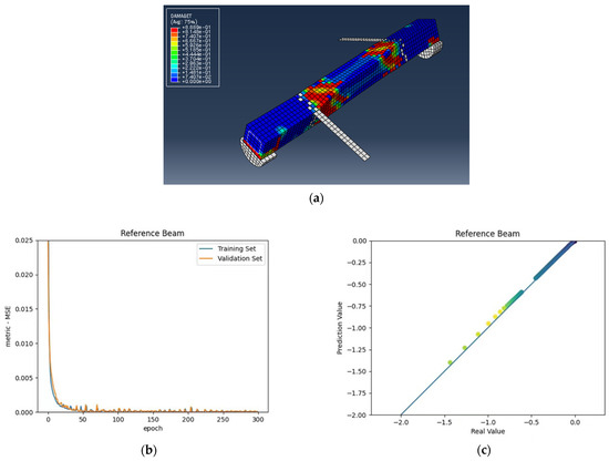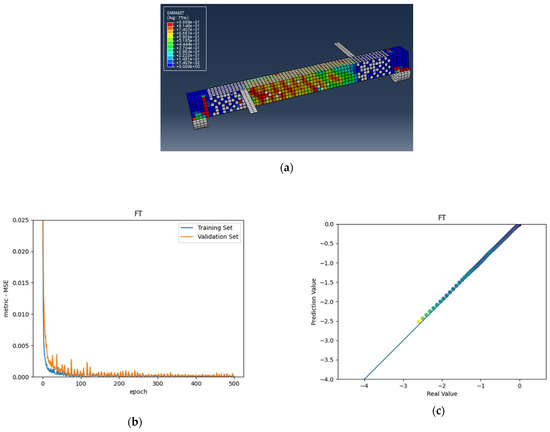 The numerical analysis of all beams above confirms that using GFRP strips as external retrofitting has desirable effects and performances in increasing the ultimate strength and significantly decreasing the crack growth, as shown in the following figures. Figure 5, Figure 6 and Figure 7 present the numerical modeling and ANN results of the reference, FT, and FL beams under combined torsion and bending. Moreover, Figure 8, Figure 9, Figure 10 and Figure 11 show the ABAQUS modeling and ANN results of 100s100, CO and 100s100, DS, and CO and DS beams, respectively. Scatter plots of target values versus predicted ANN values are shown in this section. MSE performs as the loss function during data training by ANN.