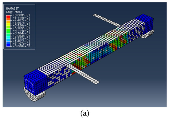 Due to severe convergence problems typically associated with a strongly nonlinear response and materials exhibiting a nonmonotonic stress–strain reaction [65], such as concrete and cohesive elements, the explicit dynamics solver ABAQUS/EXPLICIT was employed to perform the nonlinear analyses. Linear 8-noded brick elements were adopted to discretize the concrete beam and loading plates. In contrast, the longitudinal reinforcing bars and the steel stirrups were discretized with linear truss elements embedded in the concrete region (i.e., no relative displacement between the reinforcement and concrete was allowed). Linear 4-noded shell elements were used to discretize the FRP sheets. The degrees of freedom (DOFs) were tied to the respective DOFs of the underlying 8-noded 3D cohesive elements. A uniform mesh size of 25 mm was adopted upon extensive mesh convergence studies for the concrete beam, cohesive zone, and FRP sheets. The mesh size was assigned to minimize computational time while maintaining accuracy. The quasi-static response was achieved by specifying a slow displacement rate and checking that the kinetic energy was smaller than 2% of the internal energy for the most significant part of the analysis.
