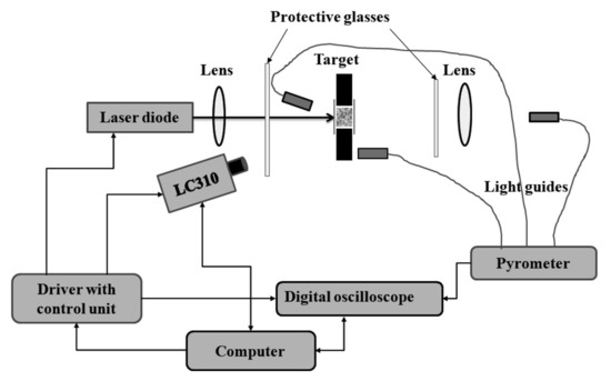 Similar research stand was described in work [55]. The paper [57] describes a test system in which a beam splitter is additionally used before the radiation falls on the sample, to record pulse duration and energy (radiation) density. In the system presented in paper [58], showed in Figure 1. an important modernization has been applied. In this system, the radiation generated by the laser, after passing through the optical focusing system is directed to the sample. The power of the radiation, however, is determined using an optical power meter placed behind the sample. The response of the sample is determined by means of a set of pyrometers and a high-speed frame camera. The coupling used allows the laser to be turned off automatically when ignition is initiated.