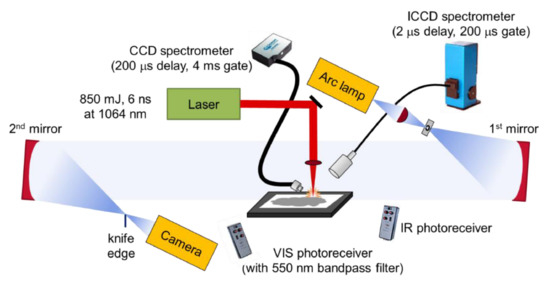 The used system, based on [78] is presented above.The sample was placed on a vertical table in the test section between two mirrors, the laser pulse was focused on the sample surface using a lens. To visualize the laser-induced shock wave generated in air, the authors used the schlieren [79] imaging technique. In the system discussed here, an arc lamp served as the source of illumination, which was focused on the first mirror using an aspherical condenser lens. The light was collimated between the two schlieren mirrors. Changes in the refractive index of air due to both exothermic reactions and shock wave motion affect the trajectory of the light from the arc lamp, allowing imaging of both the heated air and the shock wave. A high-speed color camera was used for recording. To determine the position of the shock wave, the authors of this paper used a proprietary program created in Matlab. The described system was also equipped with a CCD spectrometer, an echelle spectrometer and an ICCD. The system was optimized so that the registration of the CCD spectrometer starts with a certain delay, in order to avoid the registration of the emission generated by the plasma and to register only the emission of the burning particles. Accordingly, a photoreceiver sensitive in the infrared and in the visible light range equipped with a bandpass filter was used to record the emission over time by the plasma and the BO2 emission over time.
