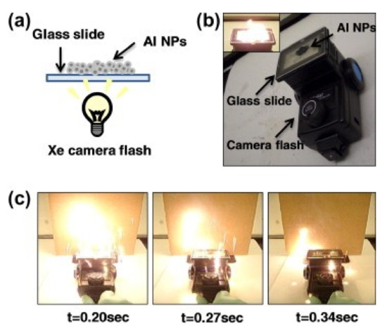 Flash ignition test idea and sequence of photos captured during the test: (a) Schematic; (b) optical images of the experimental setup; (c) Photographs of the combustion of an Al/CuO thermite. Reprinted from [121] with permission of Elsevier.