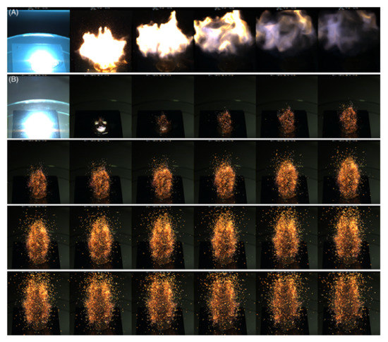 Sequence of photos captured during the flash ignition test. Photographs taken in 1 ms intervals, depicting the combustion of (A) Al/SnO2–PAni-7.7 and (B) Al/SnO2 thermites. Reprinted from [49] with permission of John Wiley and Sons.