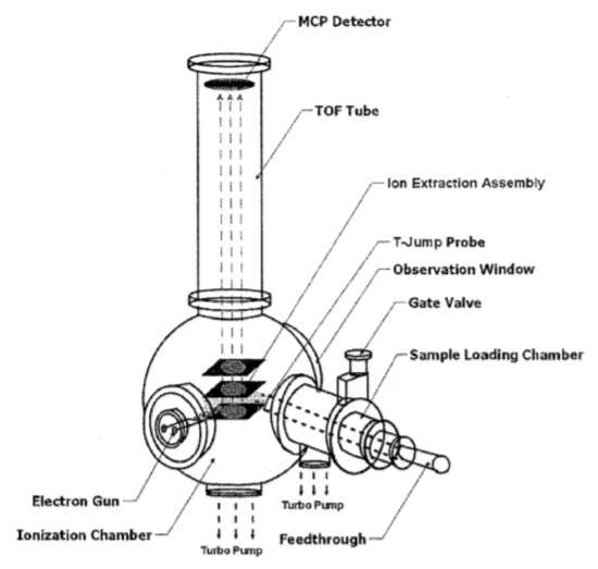 The system consists of a TOF chamber, an electron gun, and a T-jump segment. A high current DC power supply polarizes both the repulsion and extraction plates. Ionization occurs for a preset time between the plates, after which the voltage on the extraction plate is changed to create a field for ion extraction. The extracted ions flow through a TOF tube and are counted in a microchannel plate (mcp) detector. The process is then repeated according to a preset sampling rate. A T-jump is synchronized with the TOF measurement system to correlate the instantaneous temperature with the corresponding mass spectrum. An example of the obtained time-resolved mass spectra is shown in Figure 9.