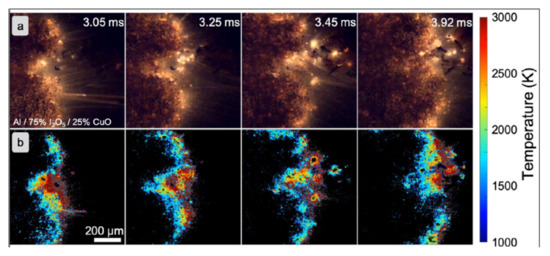 High-speed microscopy images for the Al/I2O5: (a) high-speed microscopy images; (b) corresponding temperature maps as calculated by color ratio pyrometry. Reprinted from [196] with permission of Elsevier.