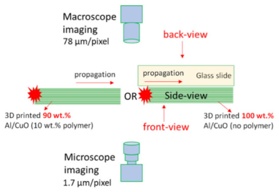 In paper [196], the authors performed a series of studies on 3D printed nanothermite compositions. After printing on the glass tray, the samples were mounted on a translation table and ignited. Propagation of the reaction front were recorded using a high-speed camera coupled with a long-range microscope calibrated for color pyrometry (Figure 11). A detailed description of the idea, is presented in [197]. Example images captured by the authors with up mentioned technique are presented in the figure below.