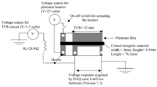 A continuous velocity probes, in designs similar to described in works [213,214] usually are not use in nanothermites study. Because of their diameters, typically in the order of tens of mm they are too big to use in charges with really small diameters. This kinds of probes also require very precise assembly in the charge axis. Probes of mentioned above sizes are going to absorb large amount of heat, so they will strongly affect the burning process. The rule of work, of continuous probes relies on change of resistance of conductor, during the welding of them by the shock front. In work [215], the authors decribed a continuous probe velocity meter system (Figure 14), based on a thin platinium layer. The authors deposited the layer of Pt on glass slides covered with alumina shadow mask. After removing of the alumina layer and connecting the wires authors deposited the nanothermite by applying multiple layers of slurry one over another. The scheme of whole test system is presented in the figure below.
