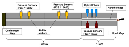 In the work [183], the system shown in the figure above was used. A plastic tube, 3.2 mm in internal diameter and 101.6 mm in length, was elaborated with 200 mg of the composition under study. The element thus prepared, after being closed in a steel die, was ignited with a spark igniter. The burning velocity was calculated on the basis of the operation time of the corresponding photodetectors. The same measurement system was used to study Al/CuO nanothermite [175] in parallel with the “on chip” measurement, in [185] to study Al/CuO, in [100] for Si/NaClO4 [180], for Al/Fe2O3. In [16], a system similar to the above has been described, where nanothermite placed in a plastic tube is enclosed in a steel matrix equipped with both photodetectors and pressure sensors. Such an arrangement allows for simultaneous detection of the FPV as well as the speed and position of the pressure wave. A further part of the system, similar in design to the shock tube, allows for the measurement of pressure characteristics.