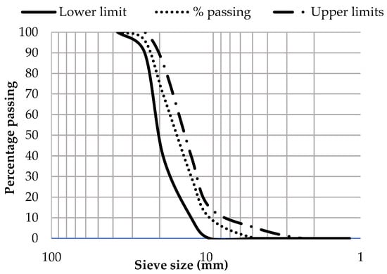 The locally available crushed stones were used as coarse aggregate in this study. The coarse aggregate was tested according to ASTM C-33 [32] and ASTM C-127 [33] for the determination of various properties listed in Table 2. The sieve analysis result is shown in a gradation curve in Figure 1. The gradation curve for the coarse aggregate used in this study was within the upper and lower limits, as defined by ASTM.