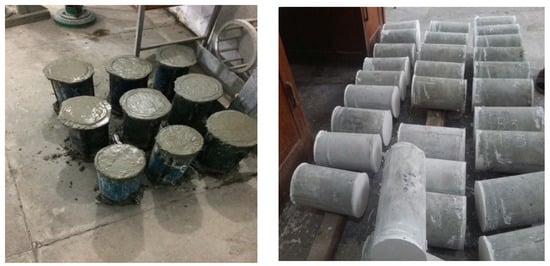A total of eighteen cylinders having a 6-inch (15 cm) diameter and 12-inch (30 cm) height were prepared for this study. These cylinders were divided into six groups on the basis of the percentage of steel fiber. Each group contained three specimens having the same percentage of steel fibers by weight. Group#1 (G1) represented the conventional concrete having no steel fibers, G2 contained samples having 1% steel fiber, G3 had 1.5% of steel fiber, G4 had 2% of steel fibers, G5 had 2.5% of steel fibers, and G6 had 3% of steel fibers as fiber reinforcement. Further, 3% was used as the maximum percentage of steel fibers as the slump value was approaching zero beyond 3%. For all the mix proportions, cement, aggregates, and steel fibers were weighed in a dry state and mixed in an electric mix machine. Water was added to the dry mixture and mixing was carried out for 200 s. After mixing, the molds were filled with concrete in three layers with each layer receiving 25 numbers of blows as per the ASTM standard specifications. After 24 h, the samples were de-molded and the cylinder specimens were wet-cured for 28 days. The studied concrete specimen is shown in Figure 4.